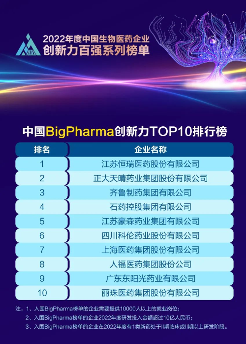 同日,2023米思会(中国医药健康产业共生大会)发布“2022年度中国生物医药企业创新力百强系列榜单”,九游会j9医药再蝉联“中国BigPharma创新力TOP10”榜首。该榜单自2021年启动评选以来,九游会j9医药稳居榜首。