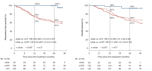 将本研究的OS、RFS与新辅助化疗/放化疗历史对照研究(CMISG1701研究[5])进行事后比较分析。经逆概率加权校正后,本研究2年RFS率为100%,较nCRT组61%有统计学显著提升(HR 0.04,95%CI  0.01-0.33;P=0.002),较nCT组63%同样有统计学显著改善(HR 0.05,95% CI  0.01-0.37;P=0.003)。同样,经加权校正后本研究2年OS率为94%,较nCRT组69%有统计学显著改善(HR 0.17,95% CI 0.04-0.76;P= 0.021),较nCT组67%同样有统计学显著改善(HR 0.13,95% CI  0.03-0.59;P= 0.008)(图3)。